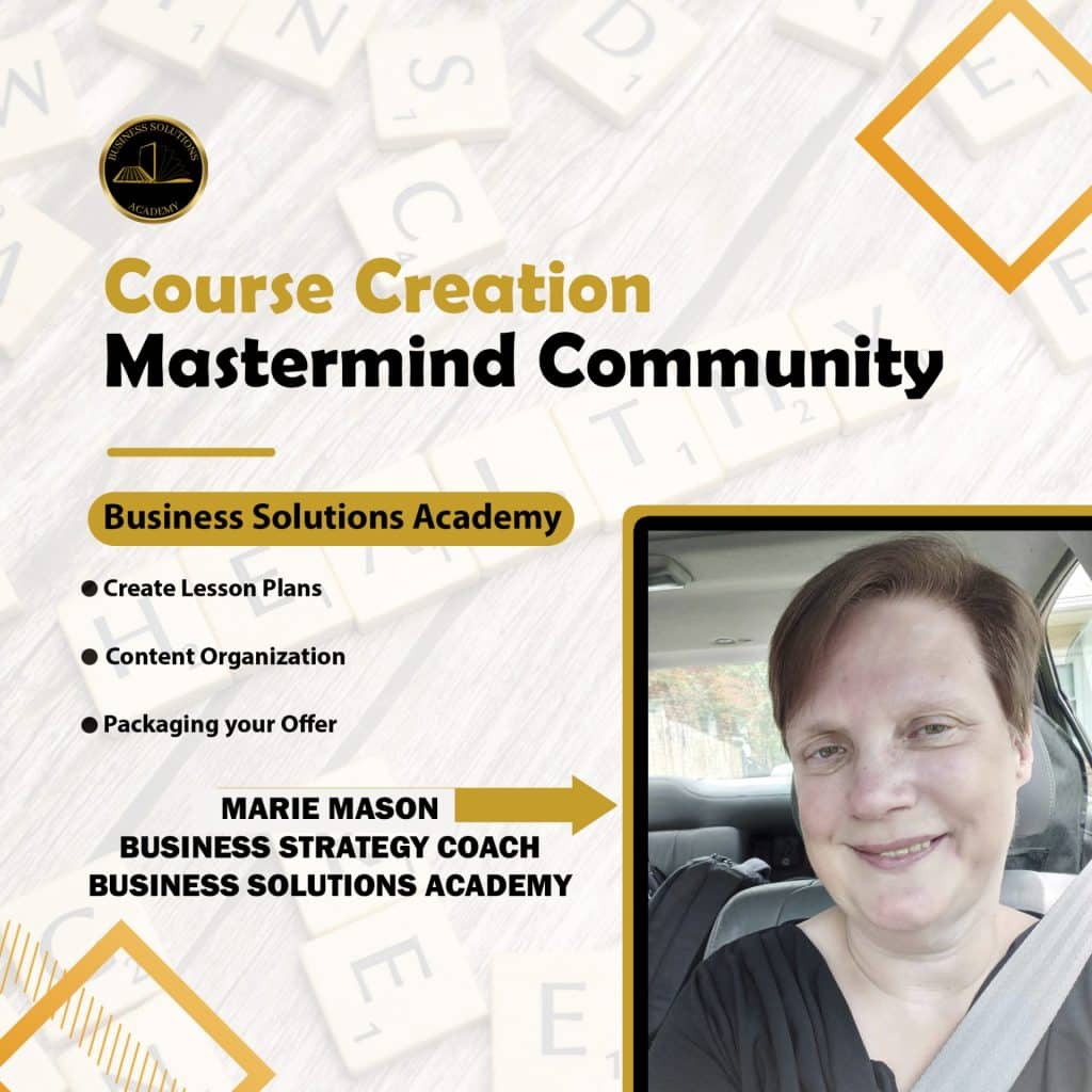 Meet Marie Mason, a business strategy coach with Business Solutions Academy. She guides coaches, educators, & service providers who have been in business for at least two years or more and are ready to turn their expertise into ready-to-sell courses with properly priced offers. We help create custom lesson plans, organize your content, and price your offers so that it attracts your ideal audience.